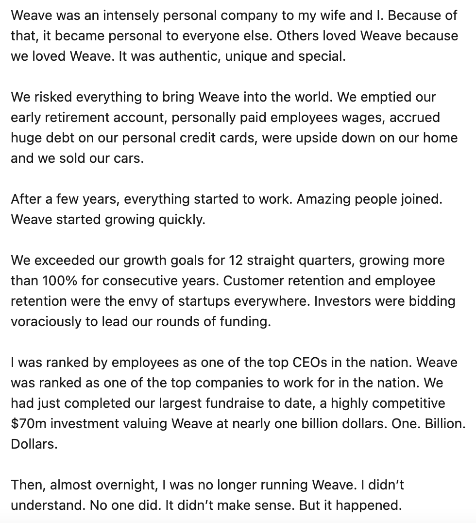 But this is where the story gets a bit dark. In 2019, Weave raised a big venture round that valued the company at $970M. Following that, the board told the Founder/CEO they thought it was time to find a new leader. And just like that, Brandon Rodman was out as CEO.