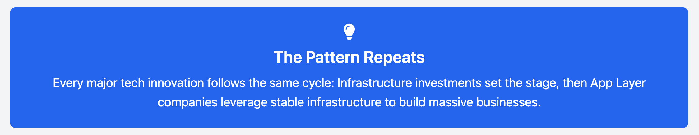 Takeaway: In any major tech innovation, Infrastructure is the initial frontier, and really sets the stage, but app-layer companies come next, and leverage a STABLE infrastructure to build massive companies. It’s also clear that there are almost ALWAYS a lot fewer winners in the infrastructure layer than there are in the app layer.