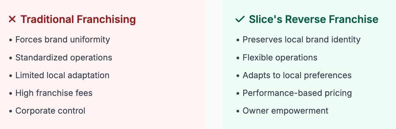 This insight became Slice's core differentiation. Instead of forcing pizza shop owners to abandon their local brand and operational preferences, Slice provides the technology infrastructure, supply chain benefits, and marketing reach of a major franchise while preserving what makes each shop unique to its community.
