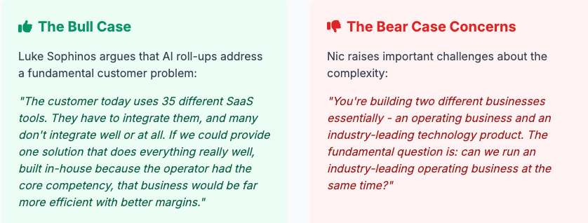 A critical question in the AI roll-up model is whether to build proprietary technology or integrate existing SaaS solutions. For Cabana, the answer was clear: build internal tools rather than rely on off-the-shelf solutions.