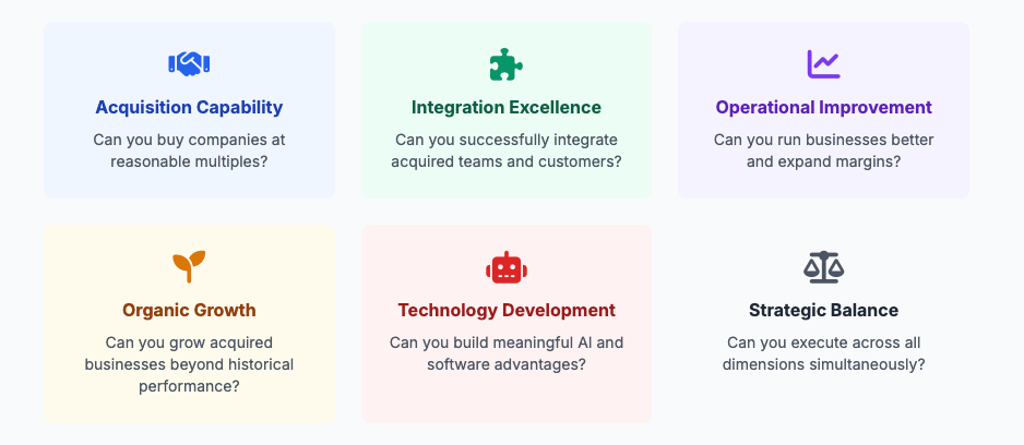 Based on the experiences shared by Jeremy and insights from industry observers, several critical success factors emerge for AI roll-up success: