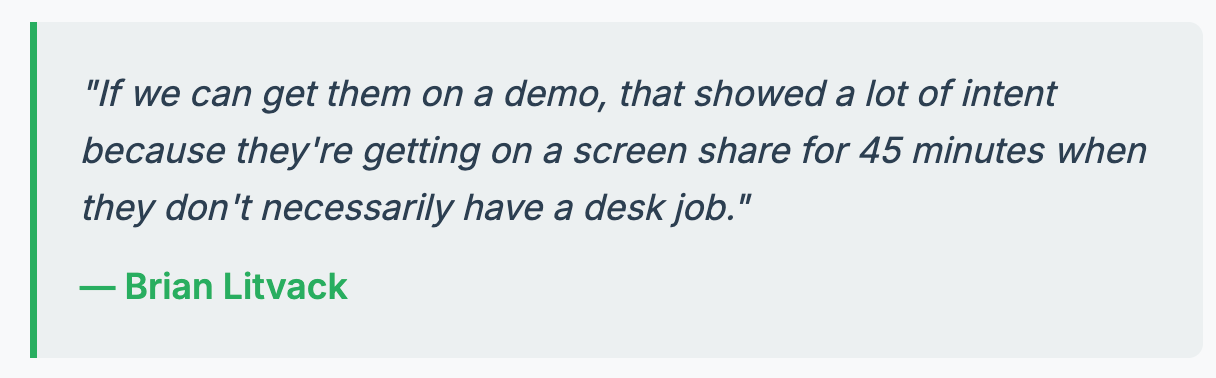 Against conventional SaaS wisdom, Brian maintained a strict separation between business development representatives (focused solely on generating demos) and account executives (who handled demonstrations and closing) regardless of deal size. Even when average contract values were just $2-3K, this specialization proved more effective than having full-cycle sales representatives trying to do everything.