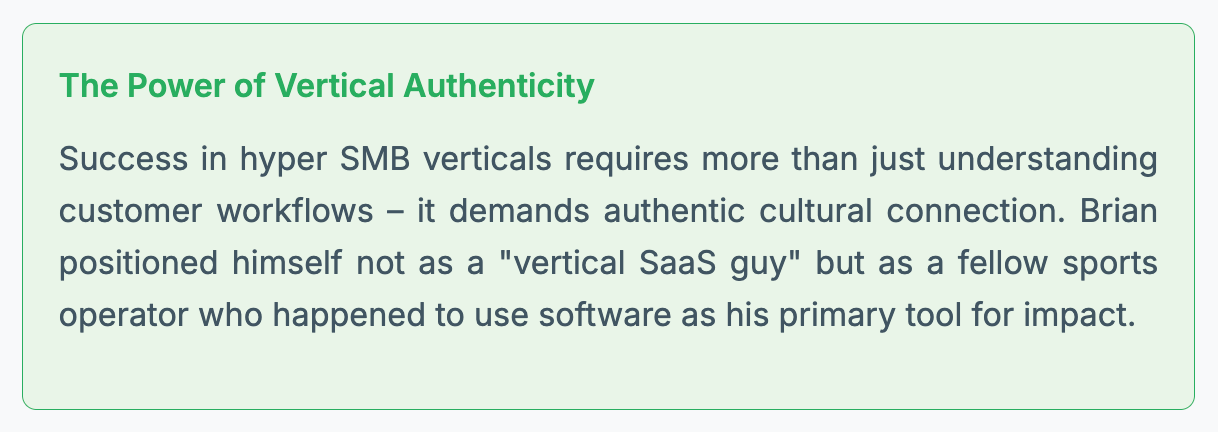 Brian's approach to market authenticity offers a masterclass in vertical positioning. Rather than emphasizing technology or software capabilities, League Apps consistently positioned itself as a sports company that happened to use software as its primary tool. This authenticity resonated with customers who saw Brian and his team as fellow sports operators rather than outside vendors trying to sell them something.