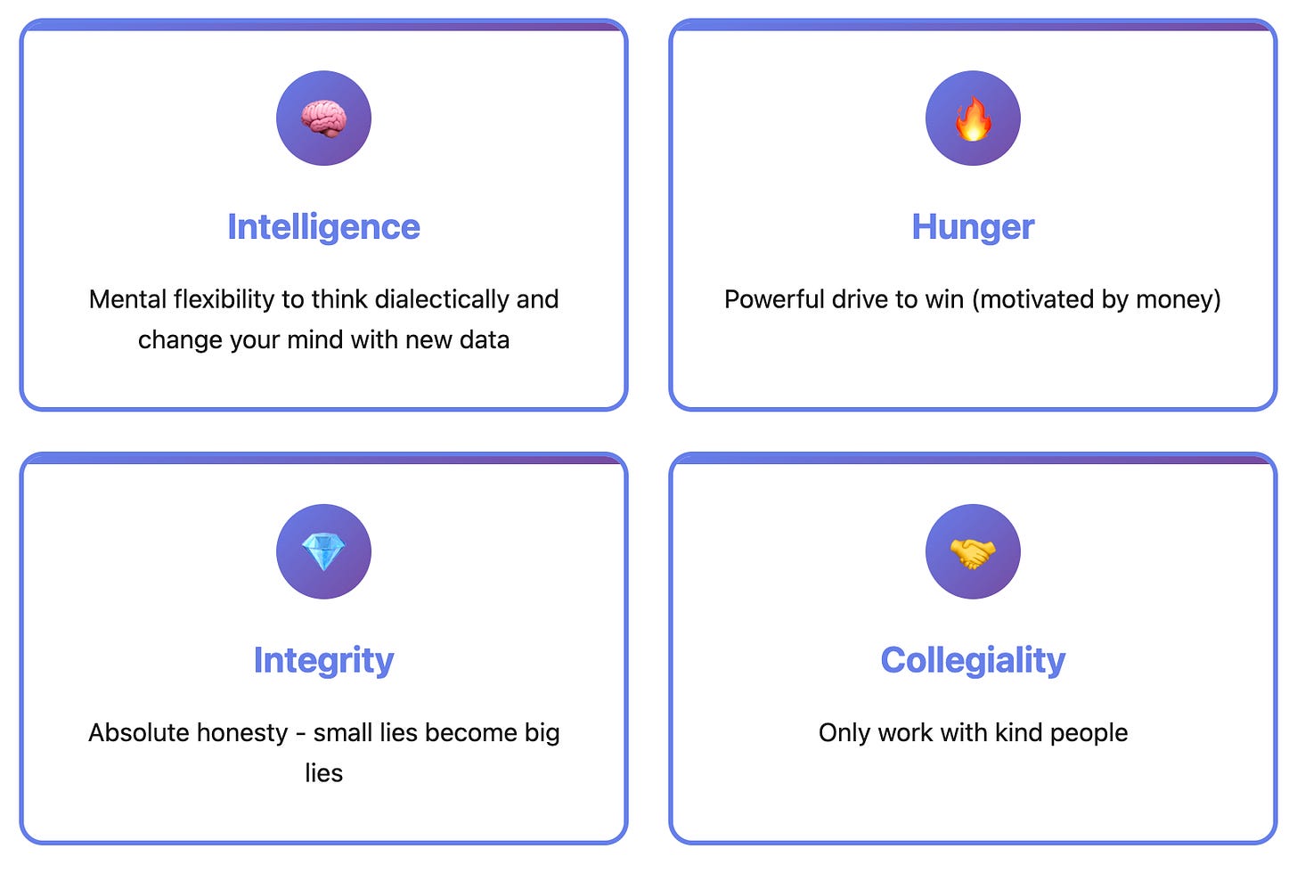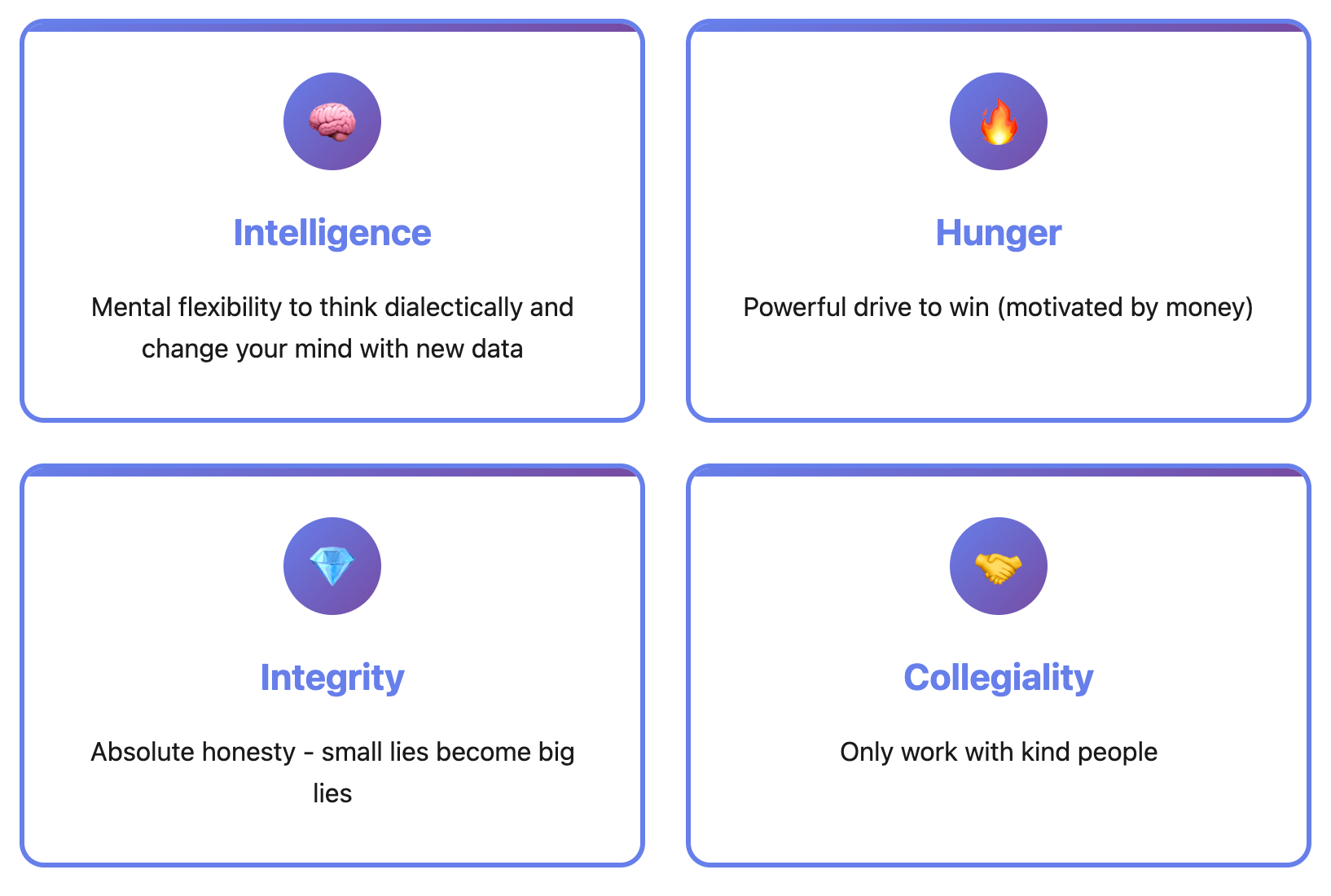 His hiring process? Often 7-8 interviews plus written questionnaires. And he’s willing to “overpay” for superstars.