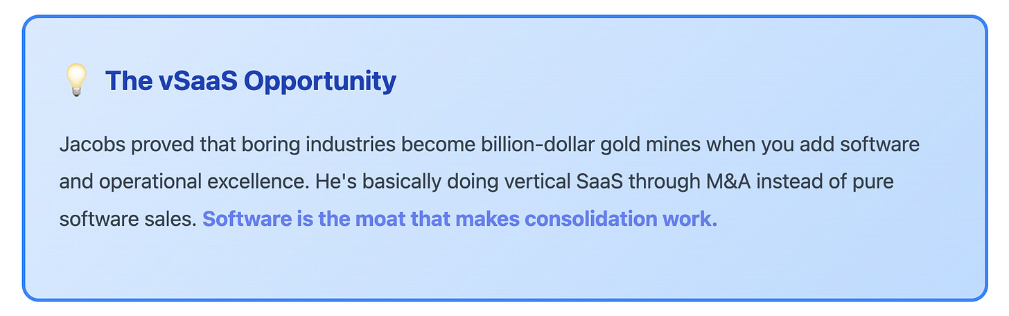 So what exactly IS the Brad Jacobs playbook? After studying his career brick by brick, I’ve identified his exact formula. And spoiler alert: it’s basically what we’re all trying to do in vertical SaaS, just with M&A steroids.