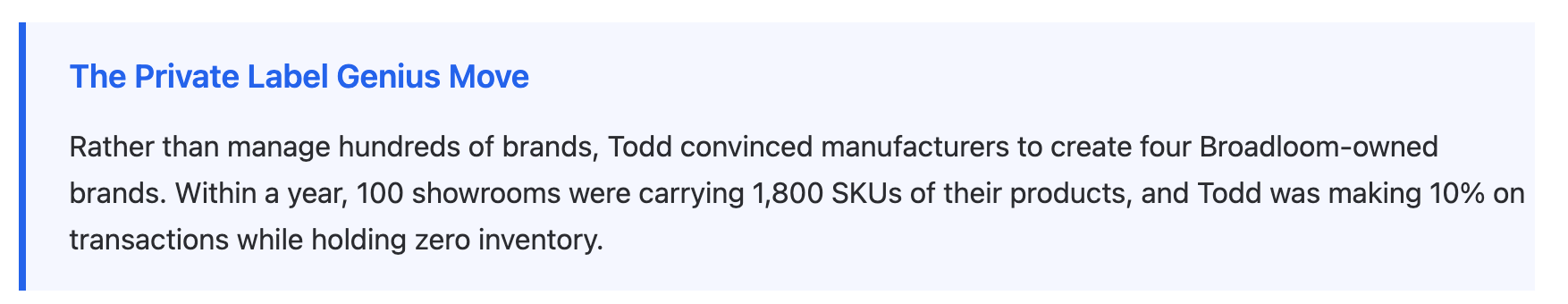 The result? A distribution channel they owned completely. At any point, Todd could reach 4,000 flooring retailers instantly. That’s not marketing – that’s a moat.