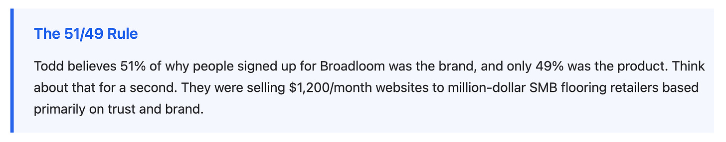 Todd estimates 51% of their appeal was brand, 49% was product. In vertical SaaS, being trusted matters more than being perfect.