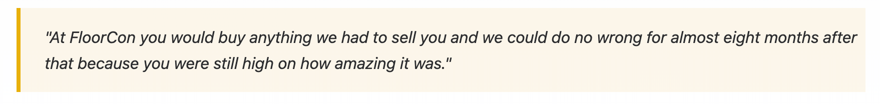 Most software companies throw user conferences. Todd threw FloorCon – and the difference is everything. While industry trade shows had people “petting carpet,” FloorCon featured Tim Tebow, Andrew Yang, and Joe Gibbs.