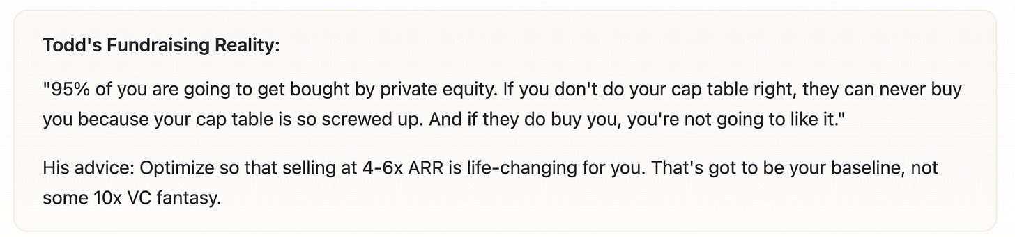 Want to dig deeper? Check out the podcast or watch the Youtube episode and subscribe for a weekly drop. Todd and I covered a ton more ground in our full conversation - including his takes on AI in vertical SaaS, the different investor classes he worked with, and some wild war stories about deals falling through. The guy’s raised money from angels, VC’s, growth equity, PE, and sold to a strategic. He’s seen more on this journey than most ever have through the full capital stack and lived to tell about it.