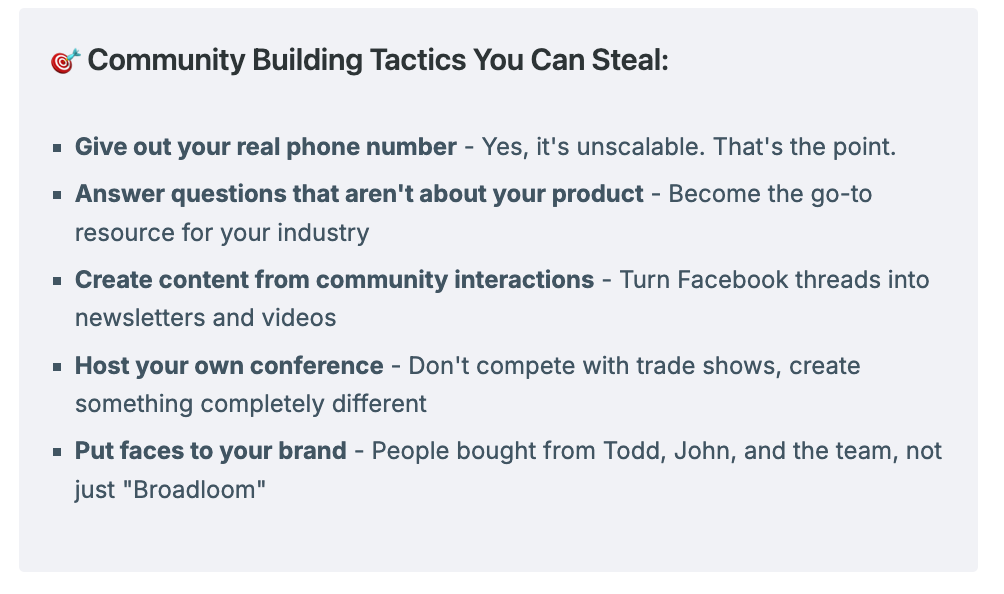 But the real magic happened with their Facebook group. While other trade shows were showing the same beige carpet samples, Todd realized retailers came to network and share ideas, not see products. He personally answered every question, even ones not related to their product. He responded publicly when customers complained, often turning critics into advocates.