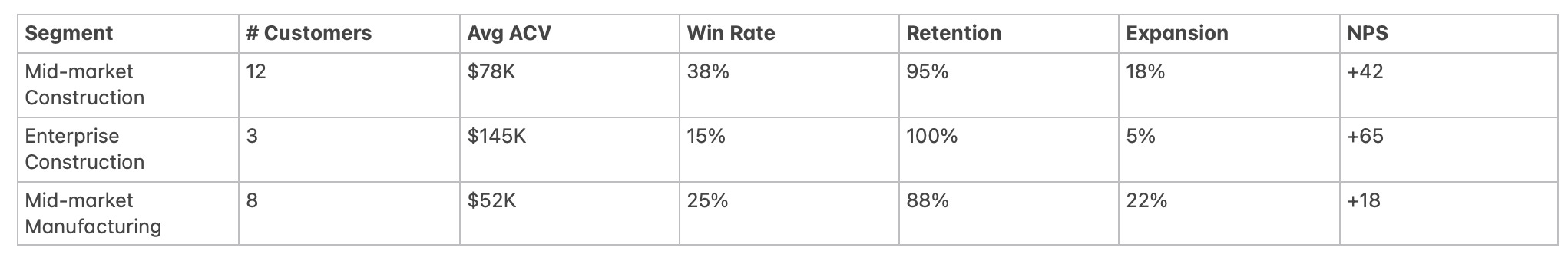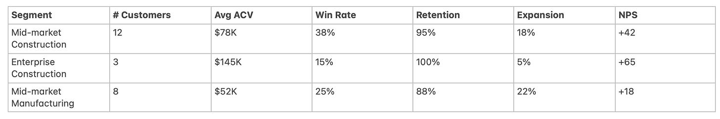 In this example, you’re winning more mid-market construction deals, at good ACV, with strong retention and decent expansion. That’s green.
