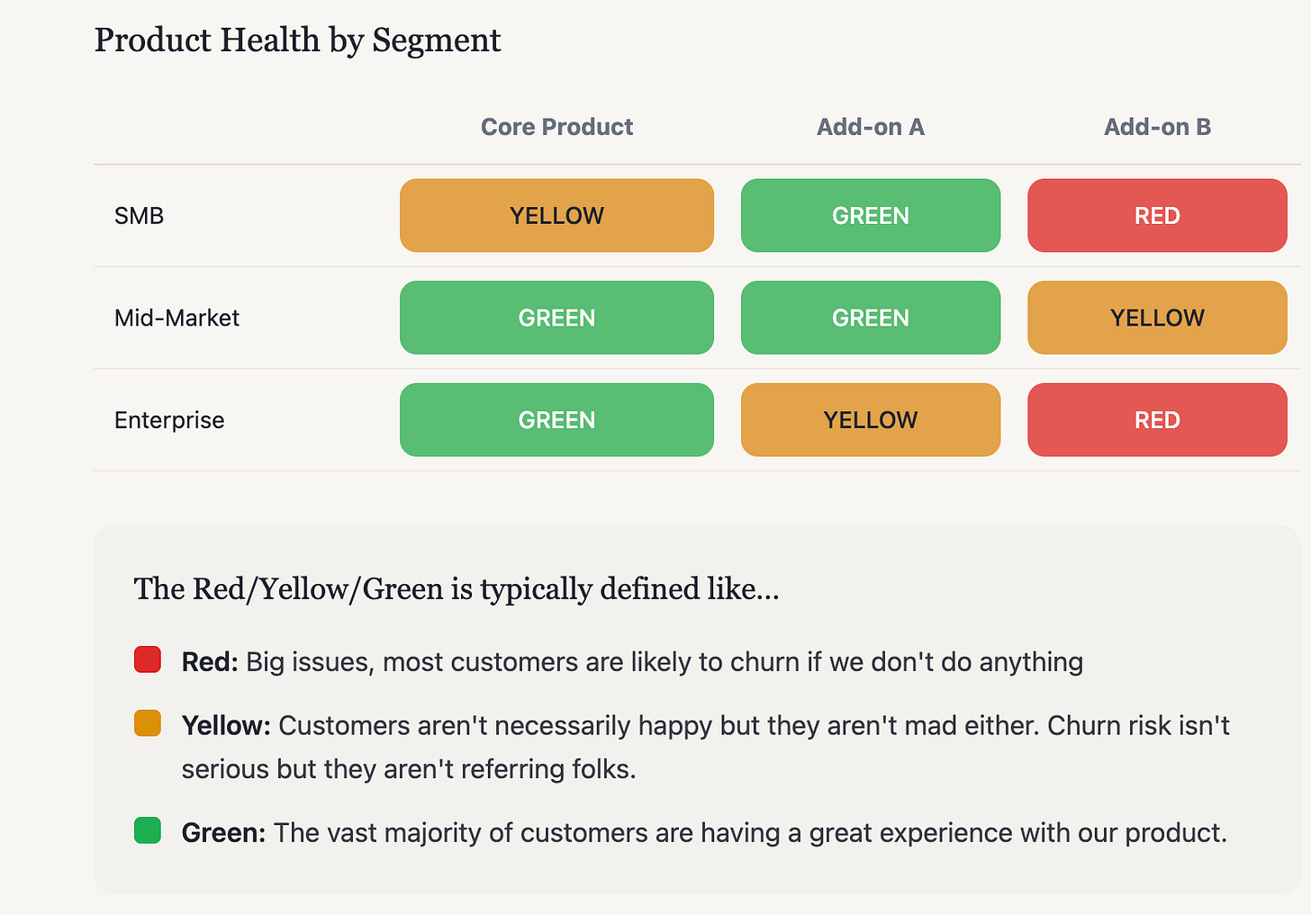 Yellow: Customers aren’t necessarily happy but they aren’t mad either. Churn risk isn’t that serious but they aren’t referring folks or speaking volumes about our offering.