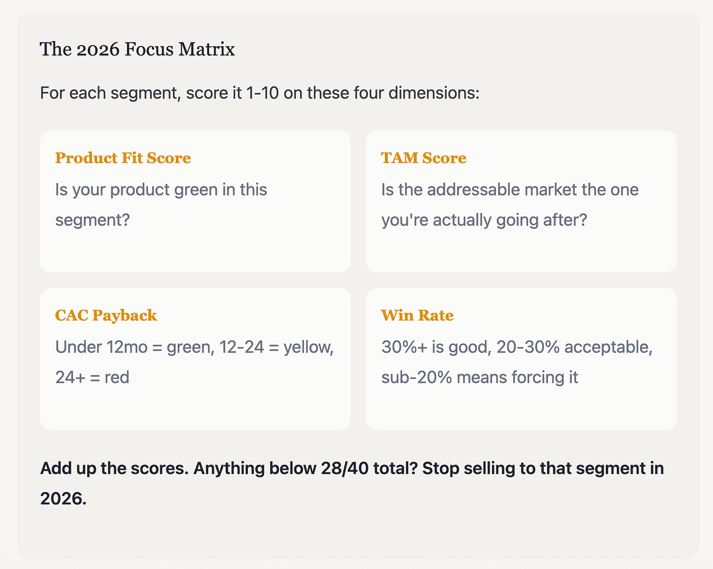 I learned this the hard way at CourseKey. We had green boxes in MM/ENT Trade Schools, yellow boxes in SMB Trade Schools, and red boxes in Community Colleges. Every quarter, some rep would close a Community Colleges and they’d celebrate. Then 6 months later, that customer would churn because our product wasn’t built for them.