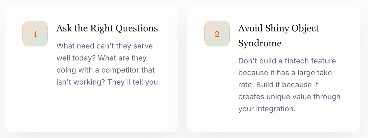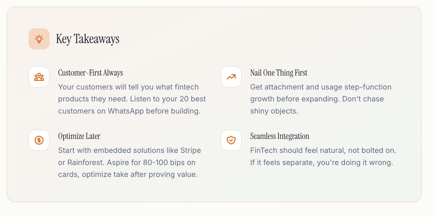 Rahul recommends a simple practice: have 20 of your best customers on a text channel—WhatsApp, iMessage, whatever works. “They’re telling you very, very transparently what’s keeping them up at night.” This isn’t just for feature feedback—it’s your early warning system for what fintech products to build next.
