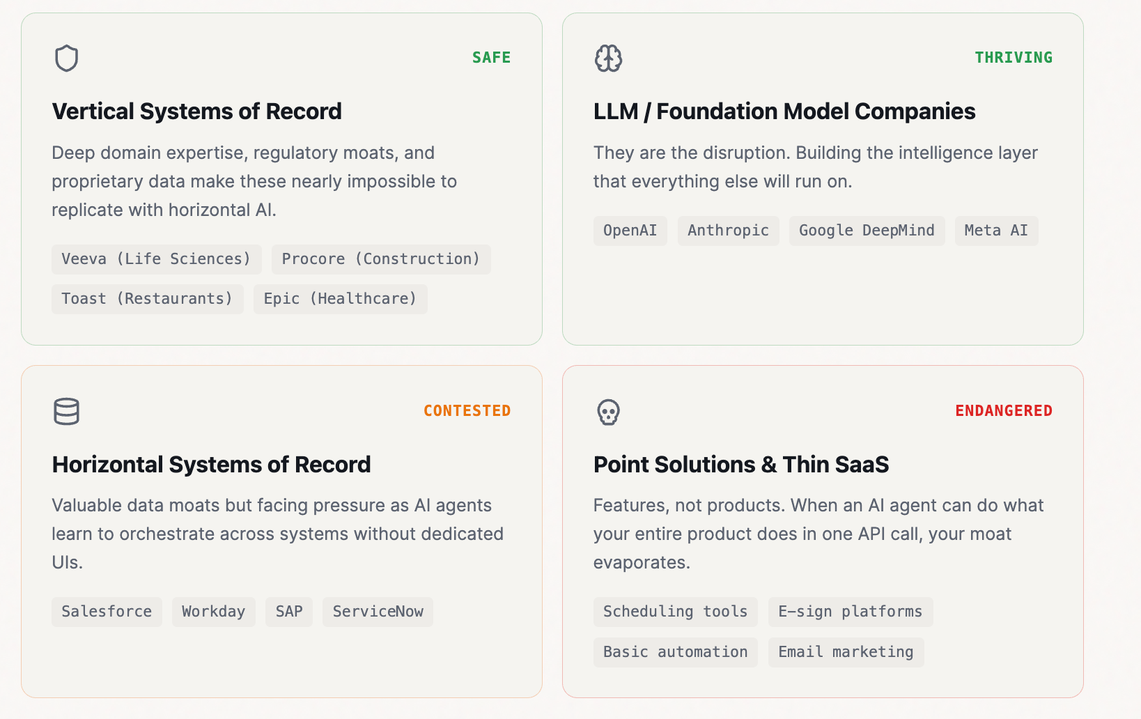 The survivors will be those who own the data (systems of record), own the domain (vertical specialists), or own the intelligence itself (foundation model companies).