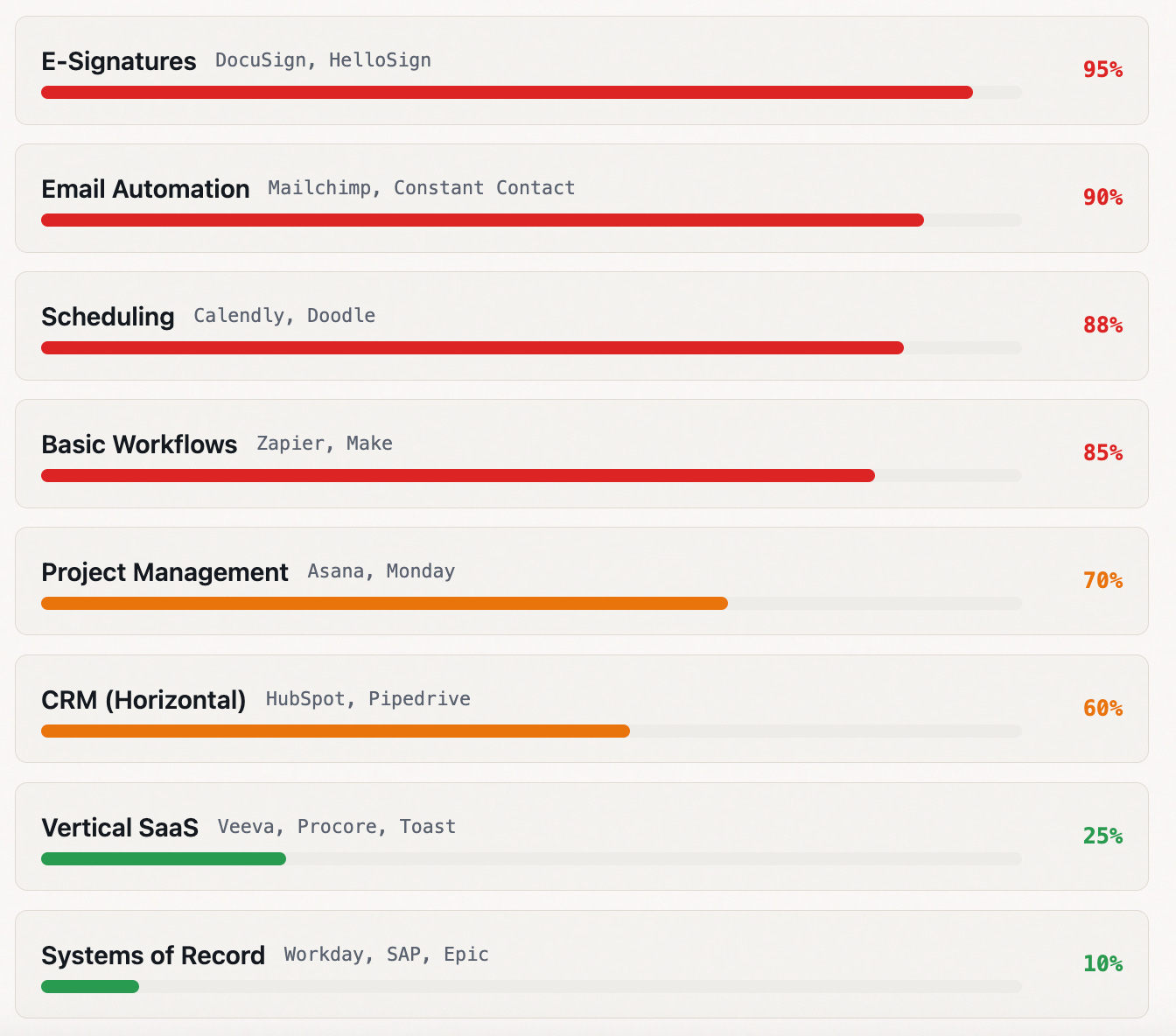 E-signatures, email automation, scheduling, basic workflows — all become features of an AI layer, not standalone products.